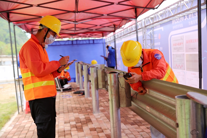 學院參賽選手正在進行波(bō)形梁防撞(zhuàng)護欄(lán)檢測項目比賽