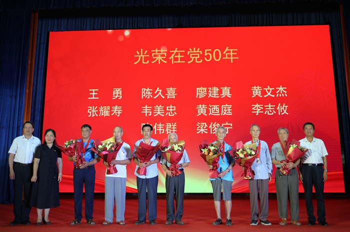 自治區交通運輸廳二級巡(xún)視員林奇茂、自治區人(rén)力資源社會保障廳二(èr)級巡視(shì)員楊春華、學院黨委書記鍾修仁向“光榮在黨50年”的(de)離退休老黨員頒發榮譽勳章並獻上鮮花