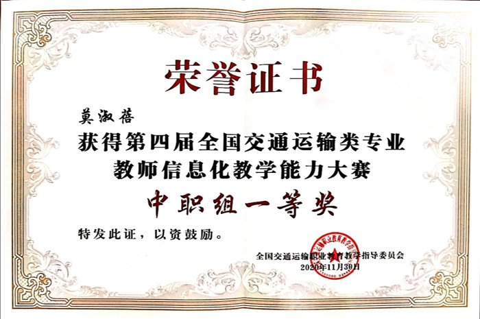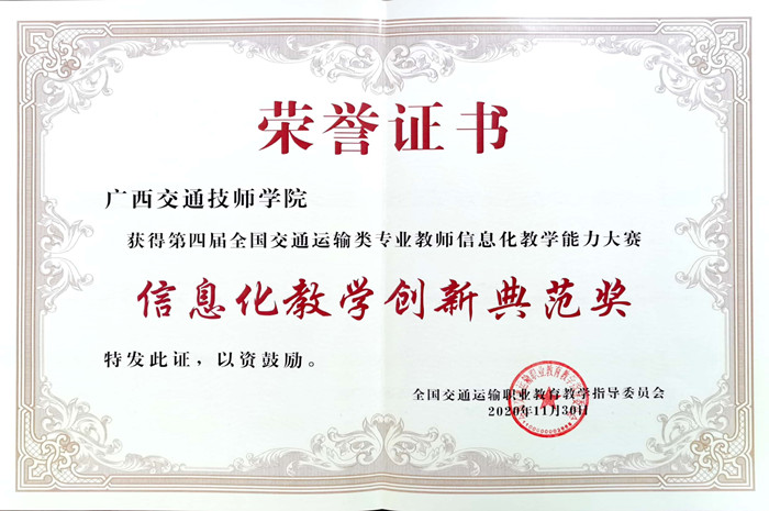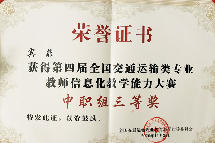 近期,第四屆全國(guó)交(jiāo)通運輸類專業(yè)教師信息化(huà)教學能力大賽決賽(sài)於四川成都順利落下帷幕。我院汽車工(gōng)程係莫淑蓓教師和賓菲老師(shī)分別榮獲中職組一等獎和中職組(zǔ)三等獎的成績,同時學院還榮獲(huò)了信息化教學創新典範(fàn)獎。