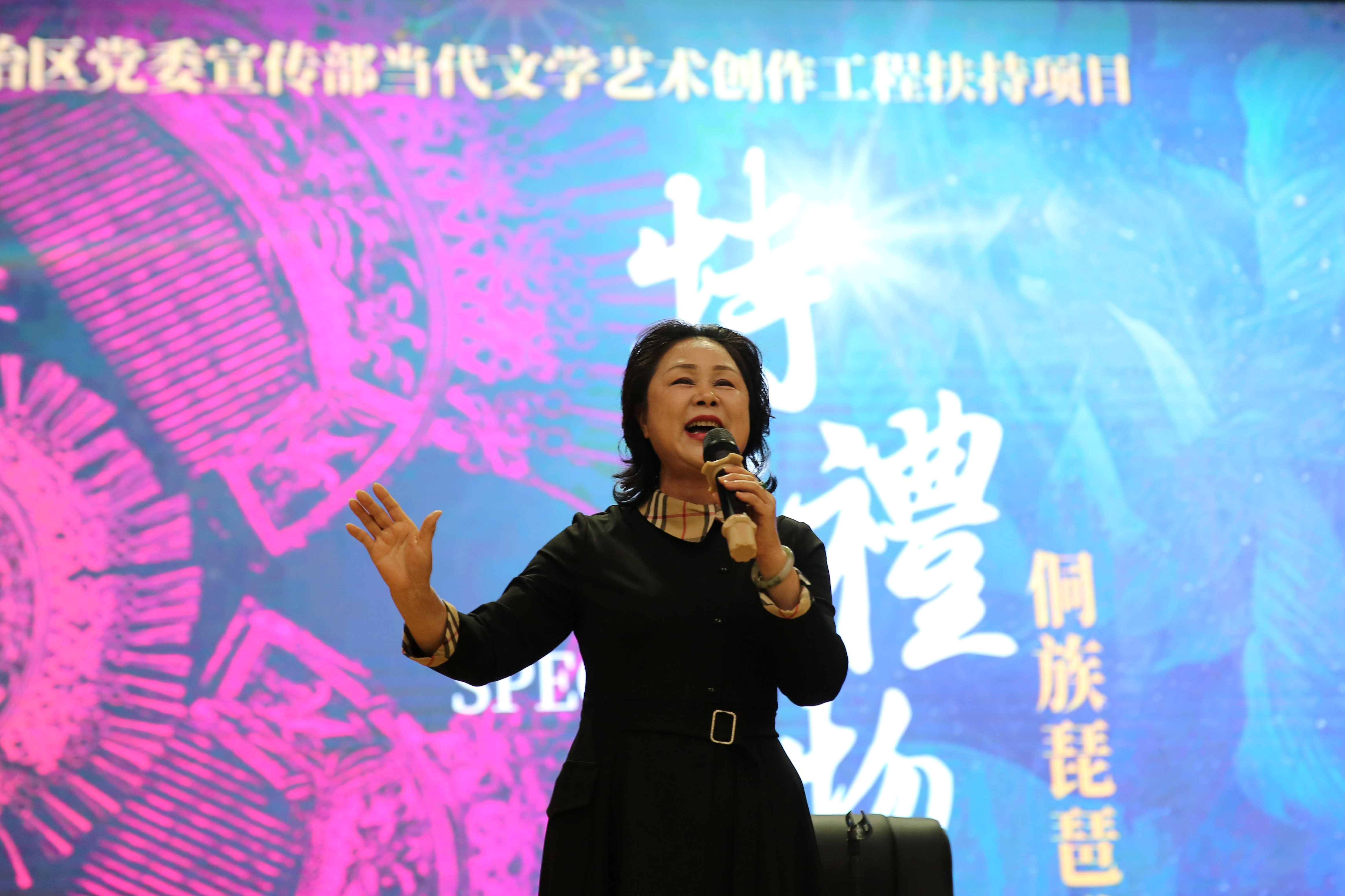 廣西民族大學原教授、廣西外國語學院聲樂教授蘇燕玲做了(le)《侗族琵琶(pá)<歌特殊禮物>的創編分享(xiǎng)及音樂賞析》專題講座,現場展示侗族琵琶和音樂(lè)元素的在曲藝作品上的運用。侗族琵琶歌《特殊禮物》節目展演結(jié)束,主演趙嘉懿、申婷分別就本人演繹(yì)的角色切換、注意細節和呈現(xiàn)方式,暢談個人演出體會(huì)、積極分享(xiǎng)角色演繹經驗。