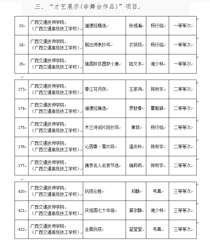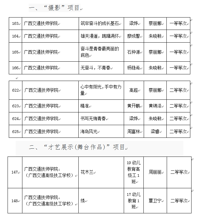 近日,由廣西壯族自(zì)治區教育(yù)廳主(zhǔ)辦的2019—2020學年全區中等職業學校“文明風采”活動競賽中,我院共(gòng)獲得一等等次7個,二等等(děng)次11個,三等等次3個,共計21個。