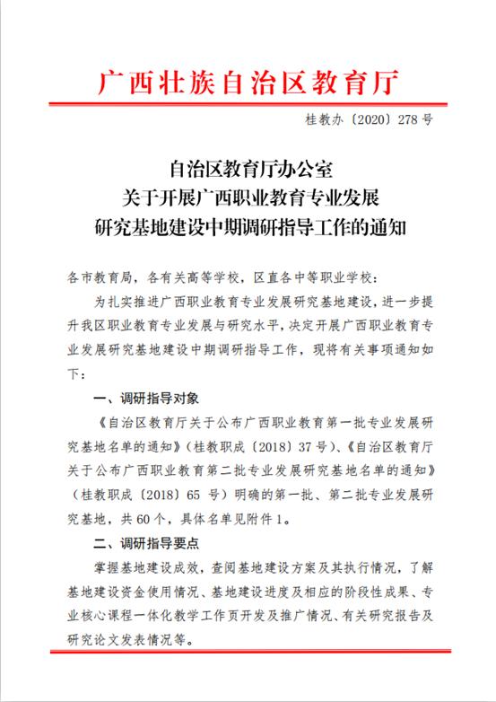 自治區教育廳辦公室關於開展廣(guǎng)西職(zhí)業教育專業發展研究基地(dì)建設中期調研指(zhǐ)導工作