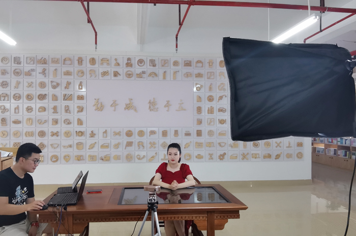 本次直播在學院圖書館進行,主持人黃穎老師在做直播前的最後(hòu)調試