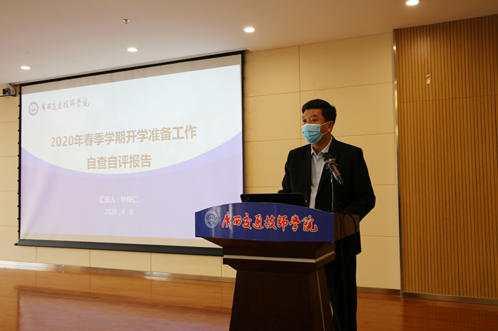 檢查評估工作會上,鍾修仁院長向檢查(chá)評估(gū)組詳細匯報了學院開學(xué)準備工作情況。鍾院長表示,學院認真貫徹落實上級疫情防控工作部署,根據(jù)全區教育係統學校(xiào)開學準備工作會議和(hé)《自治區交通運輸廳直屬學校開(kāi)學前檢(jiǎn)查評估工作方案》以及自治區教育廳、自治區人力資源與社會保障廳文件精神,紮實做好(hǎo)開學準備工作,並從組織準備、人員健康準備、防疫準備、物資準備、返校準備、教學準備、應急準備、宣傳教育等八個方麵進行了匯(huì)報。
