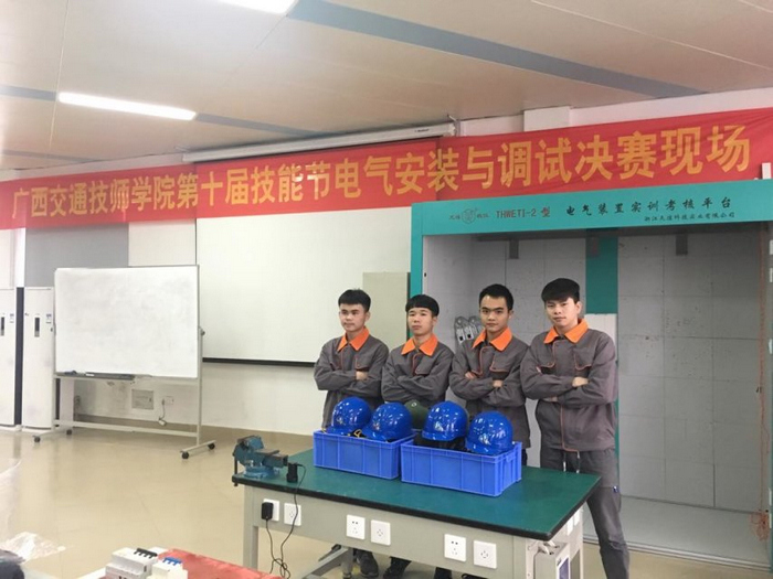從準備到正式比賽隻有六(liù)十多天(tiān)時間,時間(jiān)緊(jǐn)、任務重、比賽項目多。接到(dào)比賽通知後,學院及機電工程係對本次(cì)大賽高(gāo)度重視,機電(diàn)教研組(zǔ)長龔子龍老師帶(dài)領比賽的指導教師認真研讀比賽文件及方案、規程,認真組隊,積極備戰。經過考核(hé)篩選,最終選出電氣(qì)項目由黃盛程、甘創(chuàng)達、羅國愛、陸永(yǒng)龍四位學生(shēng)參賽,由張鵬飛、韋(wéi)海(hǎi)峰兩位(wèi)老師擔任指導老師;機電一體化項目由韋(wéi)中傑、陸達(dá)源、李兆晉、黃開卷四位學(xué)生參(cān)賽,由(yóu)陸麗霞(xiá)、謝雨、韋海峰三(sān)位老師擔任指(zhǐ)導老師(shī)。