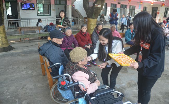 同學們把帶(dài)來的水(shuǐ)果分給老人們品嚐