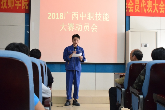 3月16日下午,2018年(nián)全區職業(yè)院校技能大賽動員會在求知樓階梯教室召開,學院副院長關菲明出席會(huì)議作動員並講話,汽車工程係、機電工程係、交通工程係、信息工程係、商務服(fú)務係等相關(guān)負責人、指導老師及全體參賽選手(shǒu)參(cān)加會議,會議由(yóu)汽車工程係(xì)主任韋軍新主持。