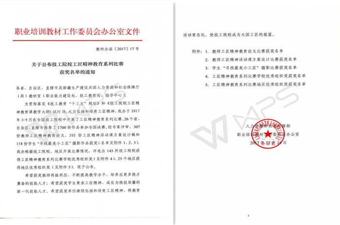 12月28日,根據人力資源和社會保障部職(zhí)業培訓教材工(gōng)作(zuò)委員會辦公室文件《關於公(gōng)布技工院校工匠精神教育係列比賽獲(huò)獎名單的(de)通知》(教材辦函〔2017〕17號)獲悉,我院陸丹丹老師的作品《因為專注,所以專業——學習工匠精神 爭(zhēng)做工匠型人才》榮(róng)獲工(gōng)匠精神活動課方案設計一等獎,16維中三班學(xué)生莫鑫民的攝影作品《刻苦訓練,精益求精》(指導教師:蔡麗娜)在學生“尋找最美小工匠”攝影比賽(sài)相機組(zǔ)中獲獎。同時,我院(yuàn)也榮獲優秀組織獎的稱號。