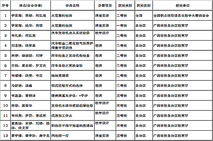 近日,全國職業院校信(xìn)息(xī)化教(jiāo)學能力大賽在山東(dōng)濟南圓滿過下(xià)帷幕。在我院院長(zhǎng)助理鄭超文指導下,我院李宣葙、賓菲、何弘亮老師的課堂實錄作品《火(huǒ)花塞的檢測》榮(róng)獲了全國二等獎(jiǎng)。我(wǒ)院其他作品也在區賽中取得優秀成績,其中一等獎1個,二等獎6個,三等獎5個(gè),我院(yuàn)還榮獲了由自治區教育廳授予的“優秀組織(zhī)獎(jiǎng)”。