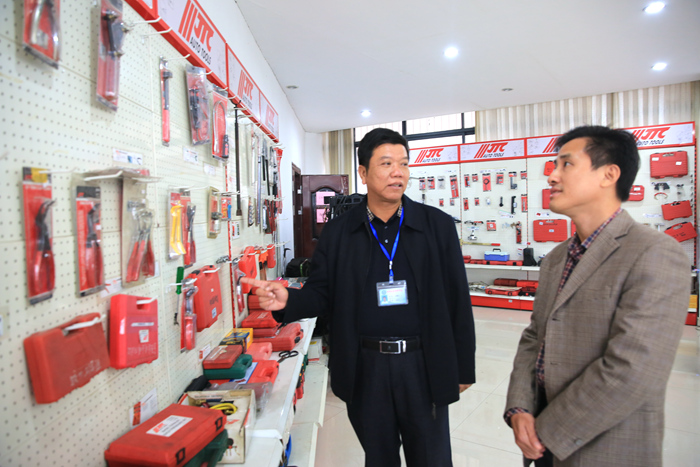 鍾修仁(rén)院長陪同黃創優(yōu)局長(右一)參(cān)觀我院大師工作室