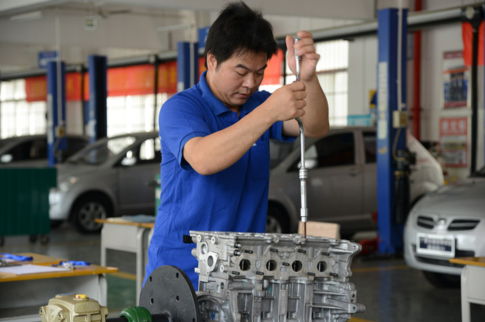 汽車(chē)維修工比(bǐ)賽選手認真比賽