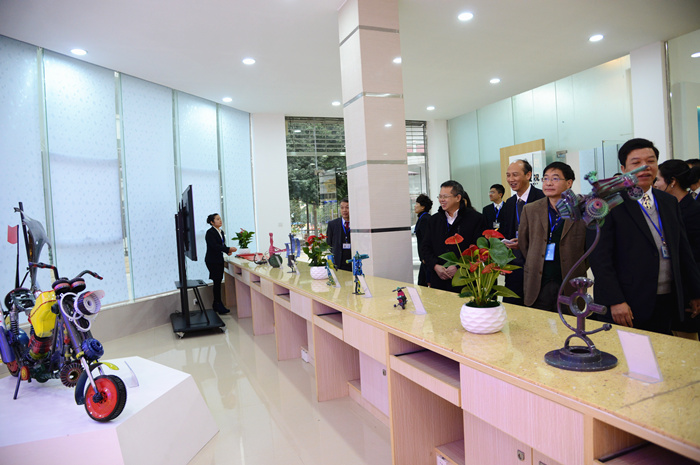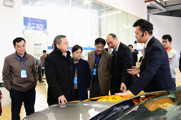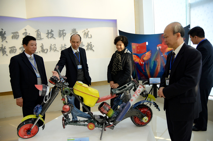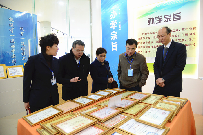 自治區交(jiāo)通運輸廳副巡視員黃小幸(左三)參觀(guān)我校(xiào)學生製作的模型