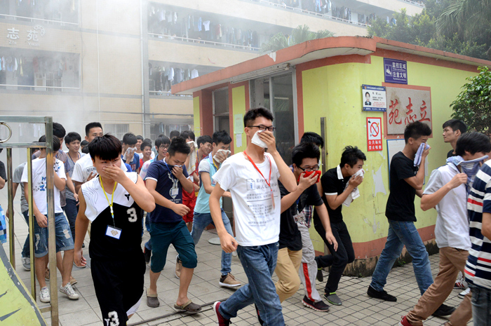 在首先進行的消(xiāo)防疏散演習中,當公寓樓門前濃(nóng)煙升起,校園警報拉響,學(xué)生們(men)迅速反應,用濕毛巾捂住口鼻,在老師的指引(yǐn)下按預定路線(xiàn)有秩序地迅速撤離,到達指定的安全地點。演習結束(shù)後,南寧興寧區消防中隊官(guān)兵現場演(yǎn)示消防滅火器(qì)具的使用方法,並指導學生進行滅火演(yǎn)練。