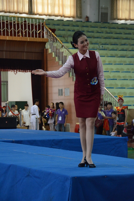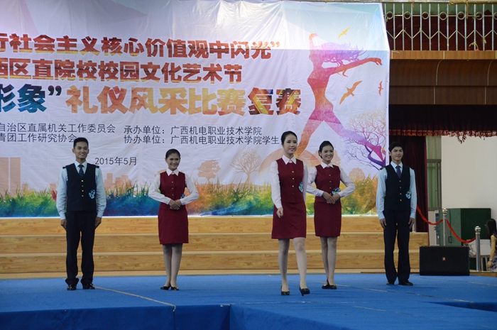 5月9日下午,第五屆(jiè)區直(zhí)院校校園文化藝術節“強素質 樹形(xíng)象”禮儀風采比賽中職組總決賽在廣西機電職業技術學院體育館進行。經過初賽(sài)的角逐,共有10個學校的代表隊進入決賽,每支代表隊的人數為5人,每隊由(yóu)三女兩男組成(chéng)。決賽由禮儀裝展示與團隊介紹和團隊個性(xìng)服裝展示兩部分組成。在信息與商務係的劉飛英老師(shī)、周麗麗老師和陳蕾旭三位老師的帶領下,13汽車維修與鈑金中(zhōng)級工1班覃冰、14西式烹飪班黎東明、13高速公路(lù)服務班羅菲雲、趙思琪、李嵐(lán)五位同學組成(chéng)了我院代表隊參加(jiā)決(jué)賽。