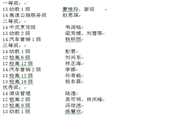經過15位選手的精彩(cǎi)角逐,最終13幼教1班的蒙桂玲(líng)、廖迎和13高速公路服務班的趙思琪憑借96.1和95.4的成績獲得了比賽的一等(děng)獎。
