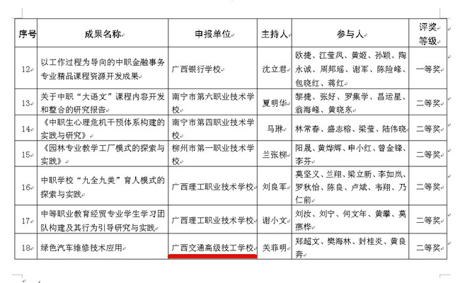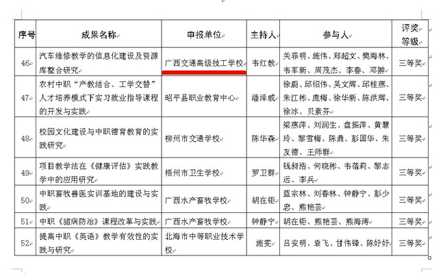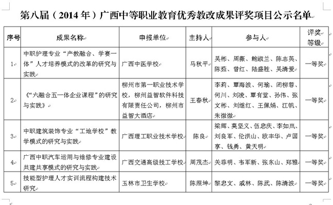 根據教(jiāo)育部《關於開展2014年國家級教學成果獎評審工作的通知》(教(jiāo)師[2013]14號)文件的要求,為推薦(jiàn)我區優秀教育教改(gǎi)成果參與國家級(jí)評選工作,1月20號,自治區教育廳向全區(qū)各中職院校發布了《關(guān)於開展第八屆(2014年)廣西中等職業教育優秀教改成果評選工作的通知》(桂教辦〔2014〕19號),計劃通過遴選出參與第八屆教學教改成果評(píng)選的優秀成果,推薦申(shēn)報國家級(jí)教學成果獎。