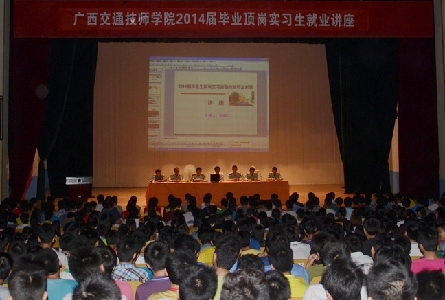 鍾副院長用生動的語言、鮮明的事例從六個方麵為2014屆畢業頂崗實習(xí)生做就業指導:首先分析今年中高(gāo)職畢業生頂崗實習麵臨的形勢;其次闡述我區交(jiāo)通發展(zhǎn)及人才需求狀況;第三進一步分析我院學生所麵臨的就業形勢;第(dì)四指導(dǎo)學(xué)生在頂崗實(shí)習前應怎麽做及如何處理考試與提前到崗的關係;第五解讀(dú)關於中職(zhí)院校直升本科院校的相(xiàng)關政策;最後是對武警南寧市消防支隊到我院錄用畢業生進行宣講和動員。
