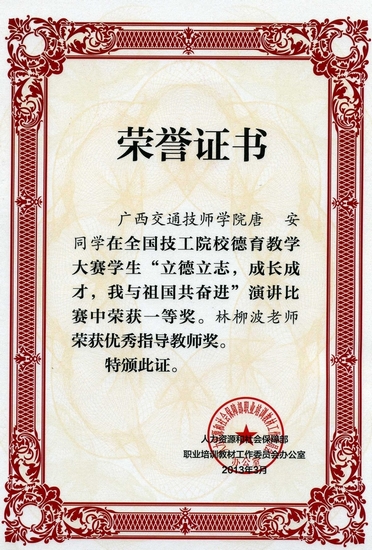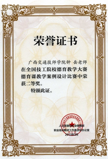 在我院院領導的深切關懷下,基(jī)礎學科部負責組織我院德育教師和學生參與比賽(sài)。通過3個月的精心準備,曆經全(quán)區(qū)評比推薦,全國決賽等環節的層層角逐,我院師生(shēng)在全國技工院校德育教學大賽(sài)中成績異常突出:學院獲優秀組(zǔ)織獎;在演(yǎn)講比賽項目23個(gè)一等獎中斬獲2名(míng);德育課教學案例設計比賽項目5位老師中4位獲(huò)獎。具體獲(huò)獎情況如下: