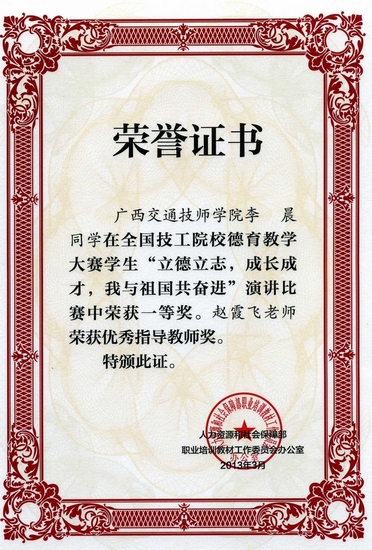 為促進(jìn)社會主義(yì)核心價(jià)值體係建設,進(jìn)一步推動技工(gōng)院校(xiào)德育工作,人力資(zī)源和社會(huì)保障部於20125-12月開(kāi)展了全國技工院校德育教學大賽,大賽包括技工院校教師德育(yù)課教學案例設計比賽及學生“立德立誌,成(chéng)長(zhǎng)成才(cái),我與祖國共奮進”演(yǎn)講比賽。