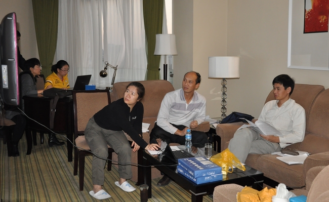 圖二:答辯工作組成員(yuán)在北京金(jīn)碼大(dà)酒店認真準備答辯資料、模擬演練答辯