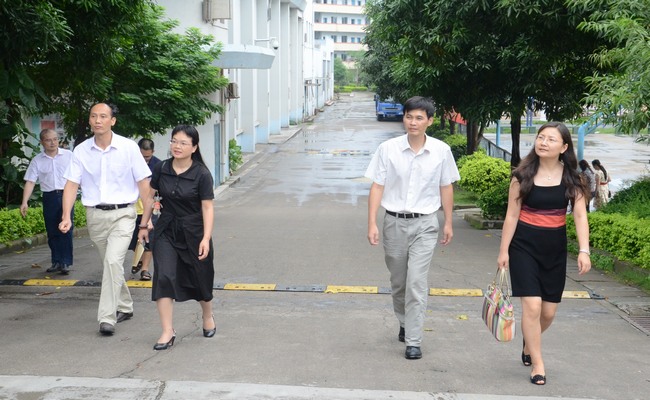 圖一:檢查組一行在學校校長韋紅教(jiāo)、副校長關菲(fēi)明的陪同下對我(wǒ)校節能減排工作進行檢查