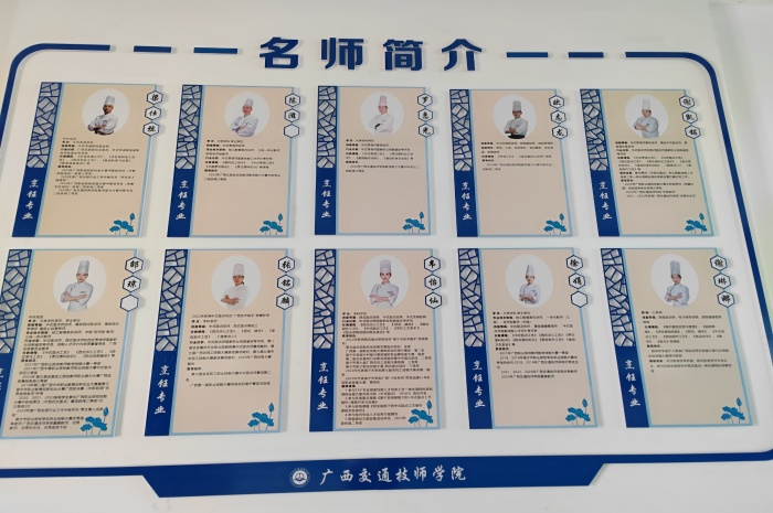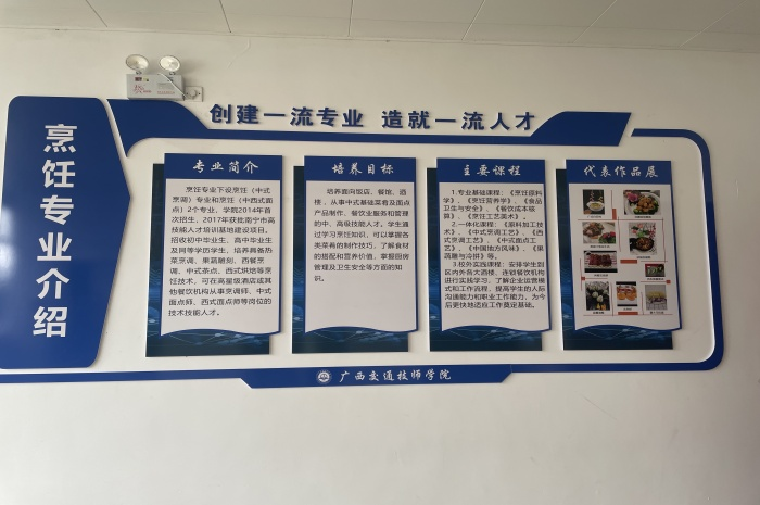 文化牆建設旨在通過名師隊伍介紹(shào)、烹飪專業介紹、中國傳統飲食文(wén)化“八大菜係”介紹、“廣西十大經典名菜”介紹、“涼菜烹調技法”介紹等,把專業文化建設與學院特色、學科建設結合(hé)起來,堅持課堂教學育人、社會實踐育(yù)人、校園文化育人的有機結合,逐步形成具有學院特色和與時俱進的(de)精(jīng)神文化、製度(dù)文化、行為文化和環境文化,讓學生做(zuò)到德技兼(jiān)修(xiū)、知(zhī)行合一,清晰了解到專業(yè)培養(yǎng)對自身實訓技能的要求,感受到學院、係(xì)部在人才培養上的殷切希望。