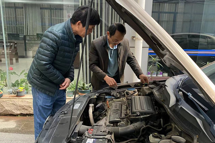 毛紅(hóng)孫和鹹棕(zōng)標老師對車輛發動機艙進行(háng)檢查