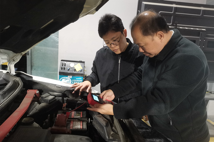 農祖軍(jun1)和李懷(huái)朝老(lǎo)師正在對車輛蓄電池性能進行檢(jiǎn)測(cè)