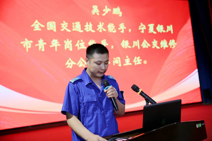 全國交通技術能手、寧夏銀(yín)川市青年崗位能手(shǒu)、銀川公(gōng)交維修(xiū)分公司車間主任吳少鵬圍繞對維修工作(zuò)的熱愛,分享了從學徒(tú)工,到維修技術骨幹,再(zài)到車間主任(rèn)的成長故(gù)事,激勵青年們(men)用勞動追夢新時代,用奮鬥建功新征程。