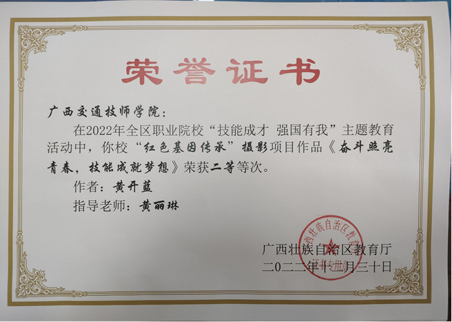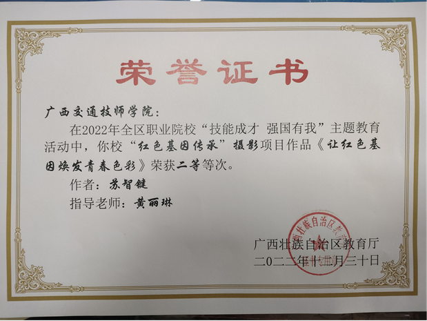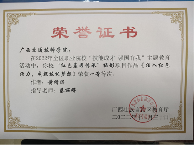 根據《自治區教育廳關於公布“技能成才強國有我”主題教育(yù)活動作品等次評(píng)定結果的通知》,我院在“紅(hóng)色基因傳承”攝(shè)影項目中獲得了2個一(yī)等(děng)獎,3個二等獎的佳績。