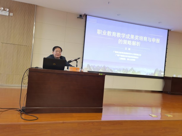 1月10日,學(xué)院特邀廣西職業教育研究(jiū)中心王屹教授作“職業教育教學成果獎培育與申報”專題培訓。學院黨委書記賴國秋(qiū)作動員講話,副院長樊海林(lín)主持培(péi)訓會。各部門負(fù)責人、骨幹教(jiāo)師、專業帶頭人(rén)等80餘人參加培訓。