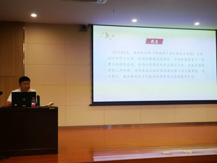 張(zhāng)振旺圍繞(rào)“嚴治黨的戒尺 幹部行(háng)為的準則”主題,分別從《中國共產黨紀(jì)律處(chù)分條例》(以下簡稱(chēng)《條例》)修訂的背景考慮、《條例(lì)》的主要內容、貫徹落實《條例》的基本要(yào)求三大方麵進行闡述對《條例》進(jìn)行(háng)專(zhuān)題解讀,並(bìng)以第二編分則中第十一章中對生活工作紀律的處分等內容為切入點,結合黨員日常的工作、生活等實際情況逐條舉例說明。