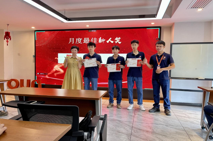 信息工程係(xì)2020級機電設備安裝與維(wéi)修(xiū)中級工2班藍秋同學獲得月度最佳新(xīn)人獎(右二)