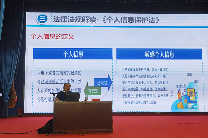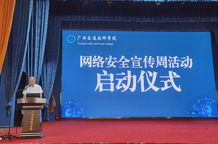 廣西(xī)工信廳信息安全測(cè)評中心產學研基地副主任趙洪剛圍繞“網絡(luò)安全為人民,網絡(luò)安全靠人民”的(de)主題,通過具(jù)體案例和理(lǐ)論知(zhī)識,從網絡安全發展趨勢、網絡安全法律法規(guī)解讀、網絡信息安全等方(fāng)麵向大家介紹如何(hé)提高網絡安全意識,提醒教(jiāo)職工和同學們要提高警惕,擦亮雙眼,分(fèn)辨真偽,加強網絡(luò)安全意識。