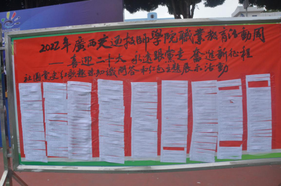 為深入落實習近(jìn)平總書(shū)記關於青年工作的重要思(sī)想,在(zài)青少(shǎo)年中廣(guǎng)泛宣傳黨(dǎng)的十八大以來黨和國家事業取得的曆史性成就(jiù)、發生的曆史性變革,營造我院職業教(jiāo)育活動周的(de)良好氛圍,展示學生社團風采,5月(yuè)21日(rì),我院學生工作科組織學院各學生(shēng)社團開展“喜迎二十大 永遠跟黨走 奮進新征程”社團黨史紅歌趣味知識問答和紅色(sè)主(zhǔ)題社團展示活動。