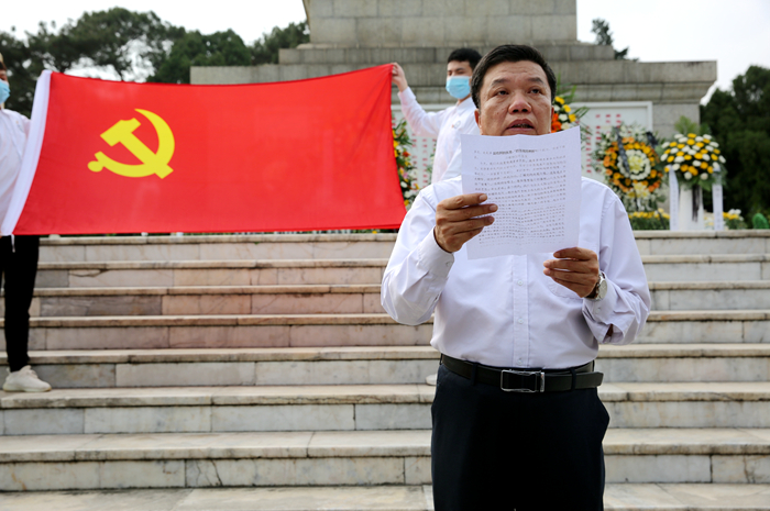 全體(tǐ)黨(dǎng)員(yuán)代(dài)表在革命烈士紀念碑前重溫入黨誓詞