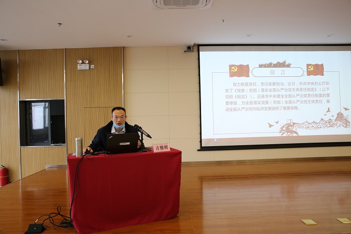 第二部分(fèn)是由學院黨(dǎng)委書記古雅明同(tóng)誌上《黨委(黨組)落實全麵從嚴治(zhì)黨主(zhǔ)體責任規定》專(zhuān)題輔導黨課。