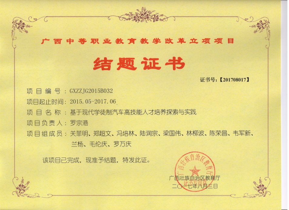 《汽車4S店實景化實訓教學體係建設(shè)與實踐》結題(tí)證書 |