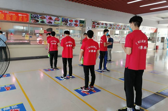 學院高度重視返校學生健康安全,每天(tiān)早中晚為每位學生測量體溫,並為每位學生每天配發2個口罩。宿舍(shě)配有消毒噴壺、消(xiāo)毒水、洗手液、體溫槍等防護物資,班級負責人嚴格(gé)按照疫(yì)情(qíng)防控複課的各項防控要求開展消毒(dú)管理工作。返校學(xué)生嚴格按照學院製定的(de)分批就餐製度錯時分批就餐,並按照(zhào)地板標簽間隔指示站位有序排(pái)隊取餐。