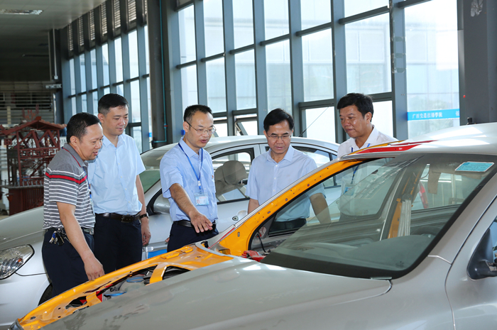 我院領導陪同自治區交通運(yùn)輸廳韋勇(yǒng)球副廳長(中)參觀考察機電工程(chéng)實訓基地