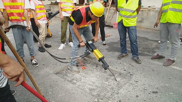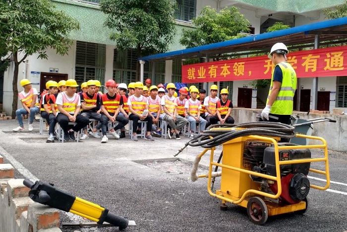 學生(shēng)操作(zuò)液壓破碎鎬進(jìn)行舊路麵破碎