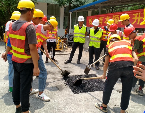 本次實訓圓滿地完成了(le)瀝青路麵坑槽修(xiū)補作業,在老師們(men)的精心指導下,學生熟悉了熱拌瀝青混合料拌合的整個流程,學會(huì)了多種(zhǒng)小型養護機械的操作要點,同時掌握了瀝(lì)青(qīng)路麵坑槽修補的工序和工藝要求。采用聯合教學,使整個實訓流程更加切合生產實際,對師生提高專業技能、實踐經(jīng)驗(yàn)、團隊合作等職業素(sù)養方麵都有很大的幫助,實現了實踐教學的目的,為學生以後的工地實習打下良好的基礎。