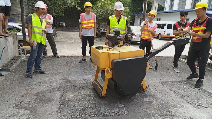 學生操作單鋼輪壓路機進(jìn)行再次(cì)碾壓