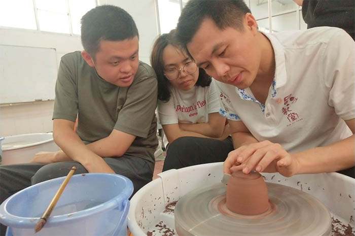 本次活動邀請到師從(cóng)欽州坭興陶燒製技藝代表性傳承人李人帡的陶藝大師曾誼老師親臨指導。曾老師就壓製陶泥、拉坯技術、素坯修整(zhěng)及(jí)製(zhì)作時的注意事項進行詳(xiáng)細講解。曾老師親自示範,在拉坯機上靈活地製作(zuò)出杯、盤、碗等精美作品,將陶藝技術的精髓(suǐ)完美詮釋。經過指導(dǎo)後,學員發揮自己的(de)創造力,用奇幻的想象和靈巧的雙手製作了一個又(yòu)一個陶(táo)藝作品。