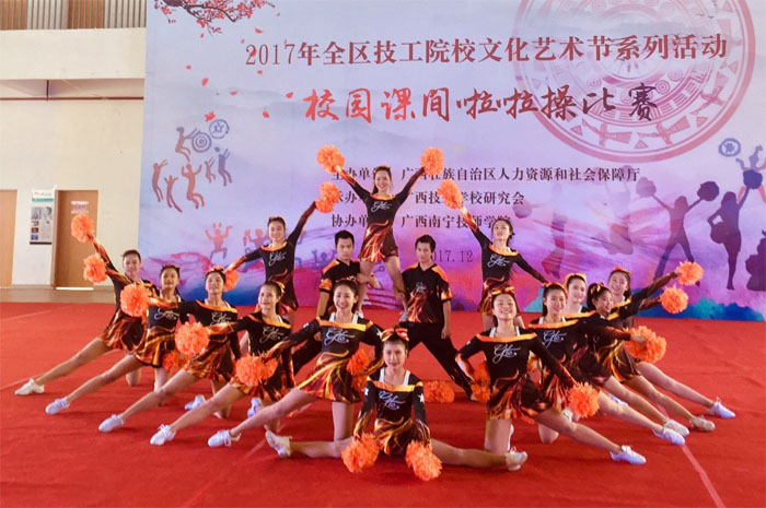 12月19日,2017年全區(qū)技工院校校園(yuán)課間啦(lā)啦操比賽在廣西南(nán)寧技師學院舉行,來自各兄弟院(yuàn)校代表共24支隊伍參賽。我院啦啦操“美少女戰隊”參加(jiā)自編校園操比賽,再次斬獲一等獎。