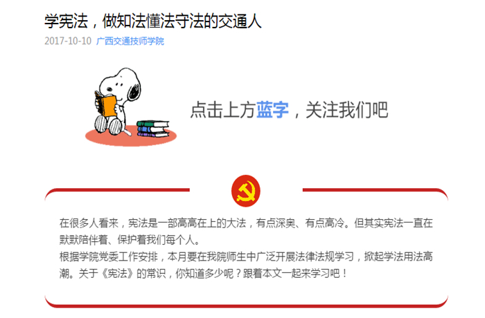 我院大力營造學法(fǎ)氛圍,使憲法人人知曉、深入人心,學院活動前(qián)期做了大量準備工作:一是召開專門會議,安排部署普(pǔ)法工作,明確普法要求和目的;二是(shì)利用微信公眾號、學院官方(fāng)網站等平台宣傳憲法知識;三是學院各黨支部(bù)組織黨員組集中(zhōng)學習《憲法知識》,並要求認真總結學習(xí)憲法(fǎ)心得體會;四是在全校各班開(kāi)展以“學習憲法”為主題的主題班會,舉行“法製知識大講堂”講座,促進學生們深入學習憲法內(nèi)容,了解憲法章程。