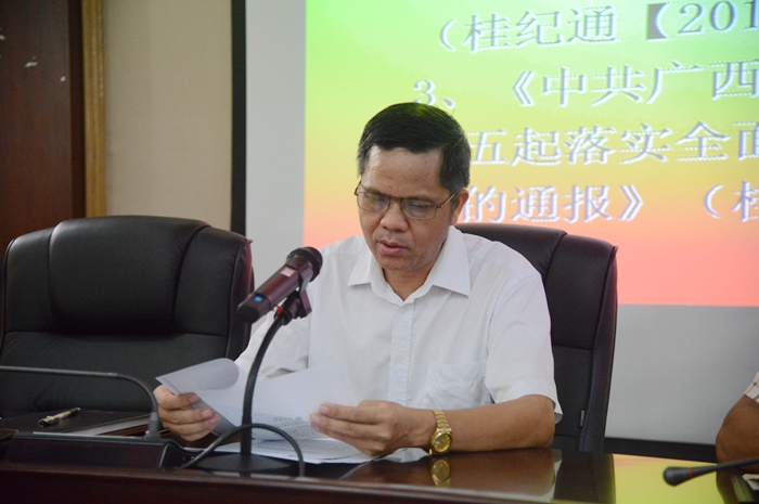 會上,陸天雲副院長通報了《關於六起高校領導幹部違反中央八項規定精神問題(tí)的(de)通報》(中紀通[2017]3號)、《中共廣西壯族自治區紀律檢查委員會關於九起扶貧(pín)領(lǐng)域腐敗問題典型案例的通報》(桂紀通(tōng)[2017]9號)、《中共廣西(xī)壯族自治(zhì)區紀律檢(jiǎn)查委(wěi)員會關於五起落實全麵從嚴治黨主(zhǔ)體責任不力典型問題(tí)的通報》(桂紀通[2017]10號)三個文件精神(shén)。