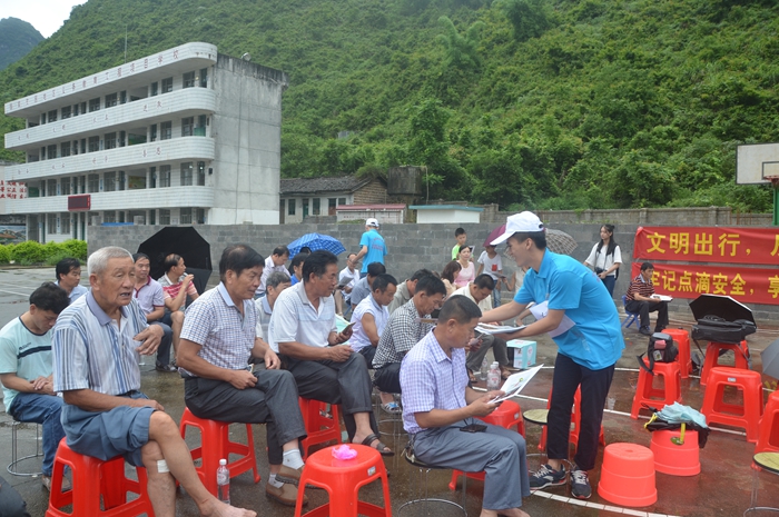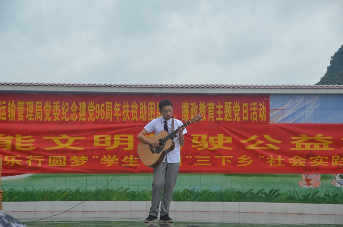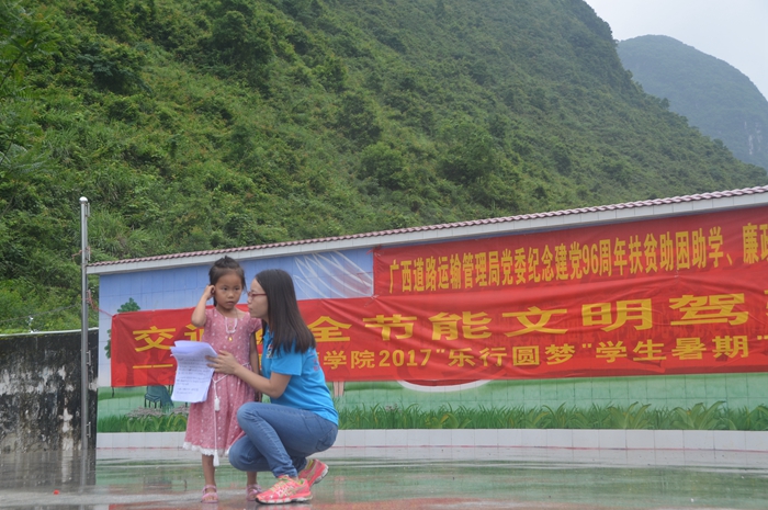 為(wéi)深入學習(xí)宣傳貫徹習近平總書記關於(yú)青年成長成才的(de)一係列重要論述,引(yǐn)領(lǐng)和(hé)幫助廣大青年學生在社會實踐中受教育、長才幹、作貢獻,以青春建功的實際行動,為全麵建成小康社會(huì)貢獻青春力(lì)量,以優異成績喜迎黨的十九大勝利召開,在學院團委的組織下,我院“樂行圓夢”誌願者(zhě)服(fú)務隊(duì)於6月30日至7月2日赴廣西壯族自治區道路運(yùn)輸管理局第一書記(jì)掛職(zhí)點國家級(jí)貧困縣羅城仫佬族自治縣(xiàn)小長(zhǎng)安鎮龍騰村開展2017年廣西大中專學生誌願者暑期文化科技衛(wèi)生“三下鄉”社會實踐活動。此(cǐ)次“三下(xià)鄉(xiāng)”我院誌願(yuàn)者服務隊以“交通安全知識進農村”為工作目的,為留守兒童及少數民族(zú)群眾進行交通安全知識普及,助力精準扶貧(pín)。