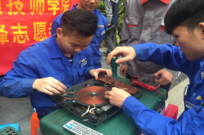 8點(diǎn)50分,同學們來到了活動現場,掛起服務旗,張貼服務內容,擺放好工具箱(xiāng)。雖然天氣陰沉,但(dàn)絲毫沒有影響(xiǎng)同學們的心情。大家為前來谘詢的(de)居民(mín)們熱心的解答關於家電及車輛(liàng)故障的疑(yí)問;居民們從家裏拿來各種出故障的小家(jiā)電,點唱機、電磁爐等等,有的還從車棚拉(lā)來(lái)了電動車。同(tóng)學們利(lì)用所學知識一邊為居民們進行家電檢測,電動車修理,一(yī)邊給居民們講(jiǎng)解家(jiā)電和車輛的日常保養(yǎng)知識,忙得熱(rè)火朝天。