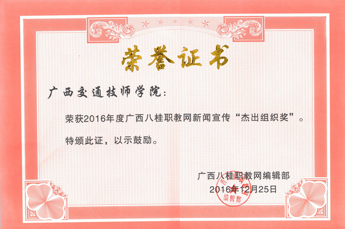 學院榮(róng)獲2016年度廣西八桂職教網新聞宣傳“傑出組織獎”